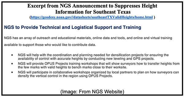 As stated in NGS’ announcement to suppress the heights in Southeast Texas, the agency has developed tools to assist users in submitted data to NGS. See the box titled “Excerpt from NGS Announcement to Suppresses Height Information for Southeast Texas.”