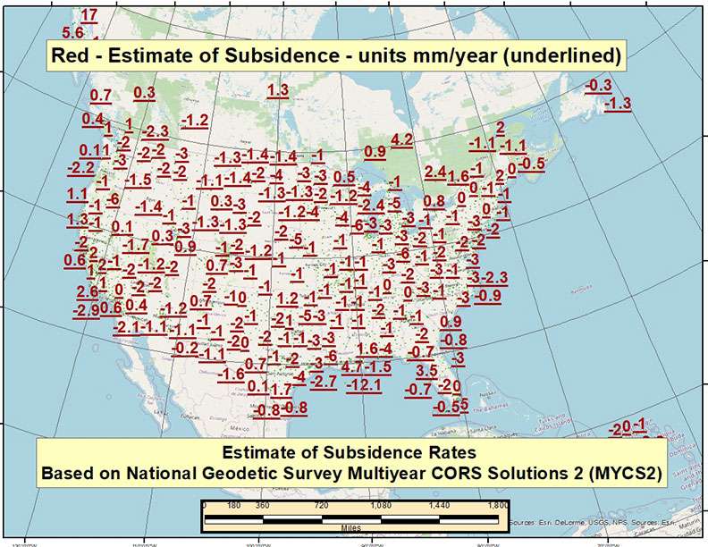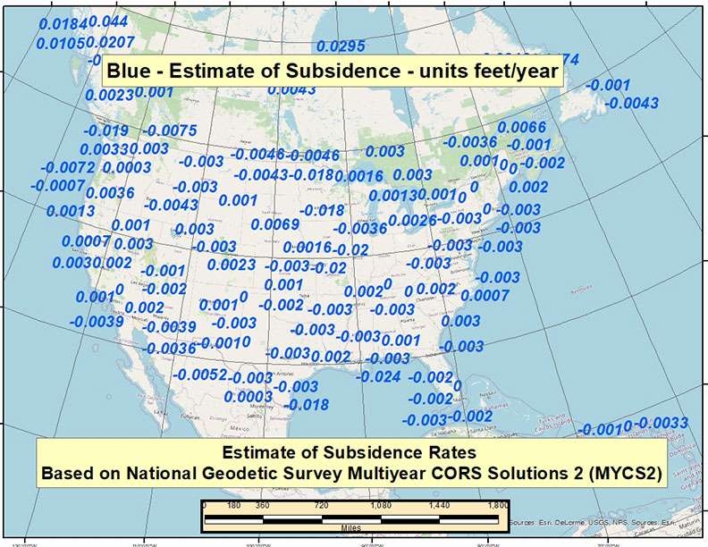 In a previous newsletter, I discussed NGS’ second Multi-Year CORS Solution of the National CORS (MYCS2). I downloaded the coordinates and velocities from NGS’ website and created a plot of the vertical velocities. For those who prefer to use feet as opposed to meters, I provided velocities with units in feet/year and mm/year.
