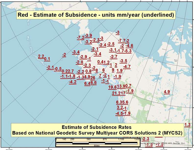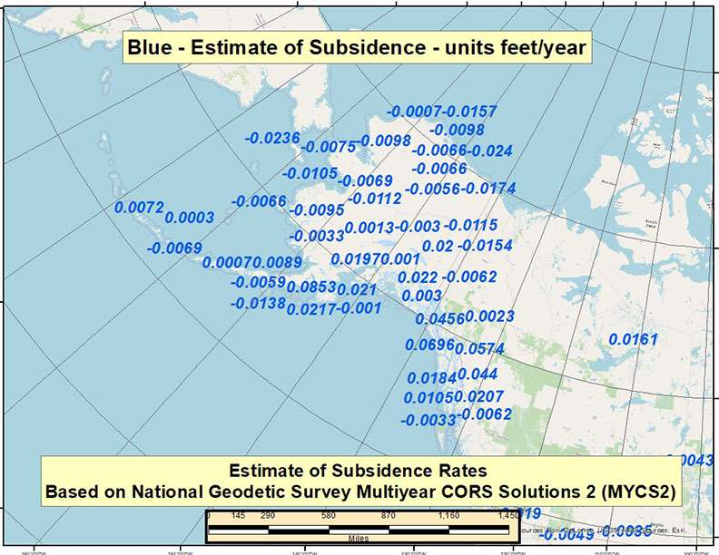 See the boxes titled “Estimate of Velocity Rates Based on MYCS2 – CONUS (feet/year),” “Estimate of Velocity Rates Based on MYCS2 – Alaska (feet/year),” “Estimate of Velocity Rates Based on MYCS2 – CONUS (mm/year)” and “Estimate of Velocity Rates Based on MYCS2 – Alaska (mm/year).”