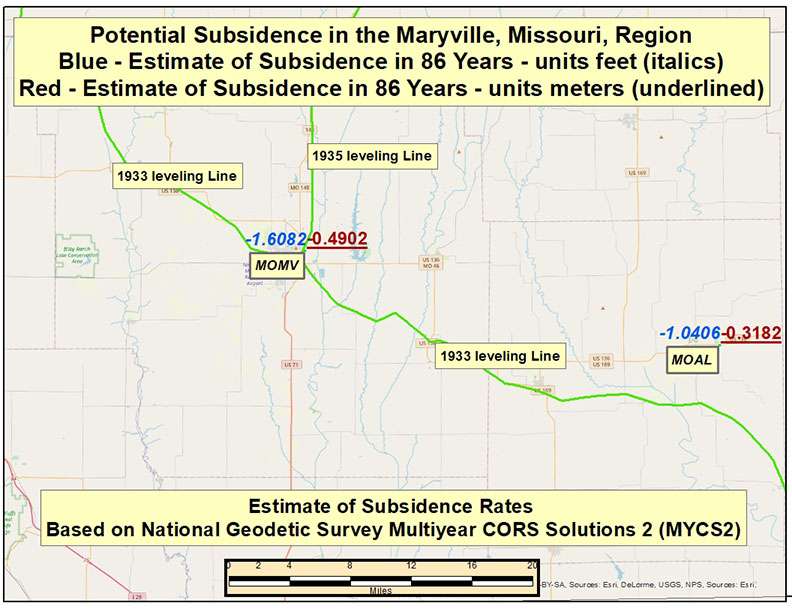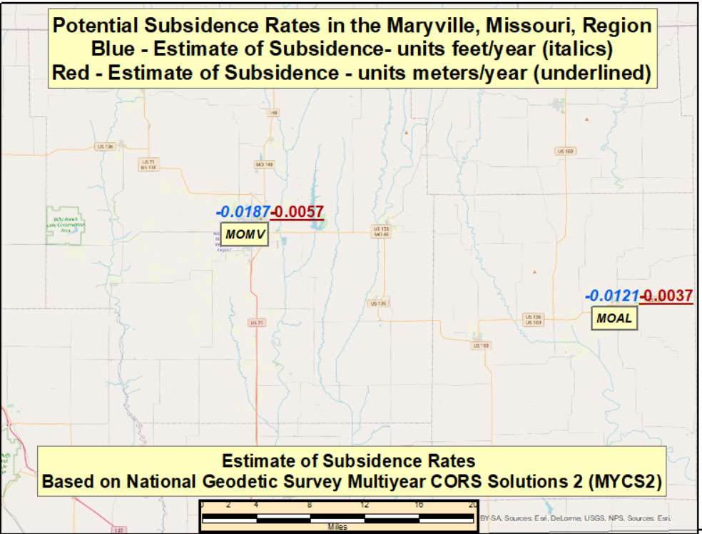 See the box titled “Potential Subsidence in 86 Years in the Maryville, Missouri, Region.” The box indicates that, if you account for the last 86 years (2021 – 1935), the potential subsidence exceeds 1½ feet (-1.6082 feet, -0.4902 meters).