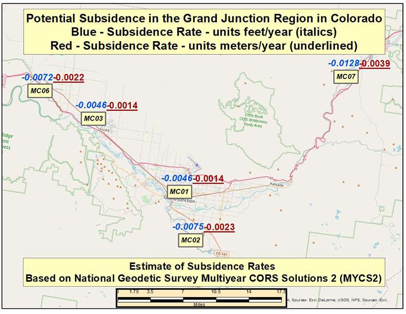 Continuing across the country to Colorado, the box titled “Potential Subsidence Rates in the Grand Junction Region, Colorado,” provides the estimate of subsidence rates in Mesa County, Colorado. As the plot indicates, the rates vary between -0.0046 feet/year (-1.4 mm/year) and -0.0128 feet/year (-3.9 mm/year). Once again, these rates all seem relatively small but many of the marks near CORS MC06 were last leveled in 1985. This means the potential change in height could be as large as 0.2592 feet (0.0792 meters).