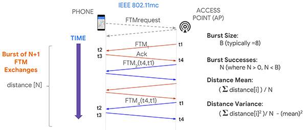 That’s where Wi-Fi RTT comes into play. It uses time-of-flight instead of signal strength. It measures the time it takes to send a Wi-Fi RF packet from an access point to a phone and back again. Because radio signals travel at the same speed as visible light, if we multiply the total round-trip time of a Wi-Fi packet by the speed of light and divide by two, we get distance, and therefore the range from the phone to the access point. That’s the basic principle.