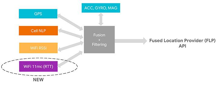 We’ve assumed that as early adopters you want to start using this API, but as we move into the relatively near future, we expect you to just use the Fused Location Provider because we’re going to be integrating the RTT capability into it. At the moment, the Fused Location Provider uses GPS (when it’s available), cell-tower signal strength and Wi-Fi RSSI, and fuses all this with the onboard sensors: inertial navigation from the accelerometer, gyro and compass. Now we’re adding Wi-Fi RTT into that mix, and it will increase the accuracy of the Fused Location Provider whenever RTT-capable access points are available nearby.