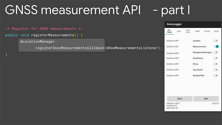 When you build an app that needs role measurement, you will need the Android location manager API with the method registerGnssMeasurementsCallback. This method requires you to pass it a GnssMeasurementsEvent callback shown here. You construct this callback, and then override the method onStatusChanged, and that will give you the integer status that we discussed to tell you if measurements are supported.