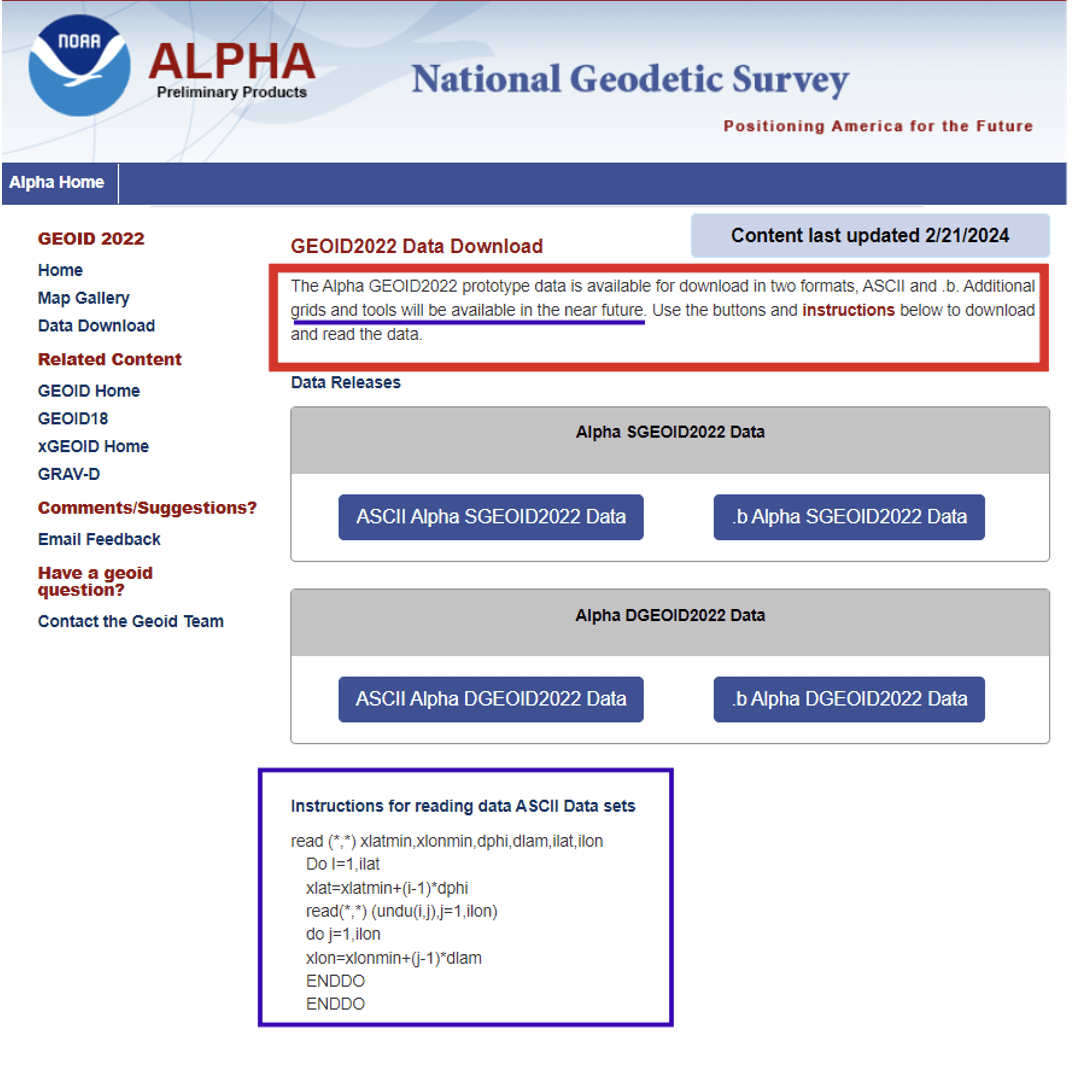 The GEOID2022 Alpha page provides a version of GEOID2022, which is the most recent prototype of the geoid models. The reference ellipsoid is Geodetic Reference System 1980 (GRS 80, but the geometric reference frame is ITRF2020). The Alpha GEOID2022 prototype data is available for download in two formats, “ASCII” and “.b.” There is a static component (SGEOID2022) and a dynamic component (DGEOID2022). These grids will be useful to programmers who want to develop and test their systems. Additional grids and tools will be available in the future.
