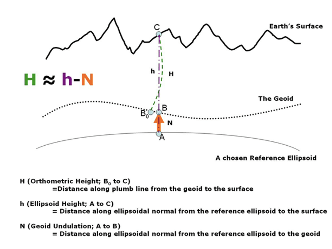 This means that leveling height differences are not the same as ellipsoid height differences. To compute a GNSS-derived orthometric height, a geoid height is subtracted from the GNSS-derived ellipsoid height. This is only an approximation because of how the two heights are measured but, at this moment, it is accurate enough for surveying and mapping applications.