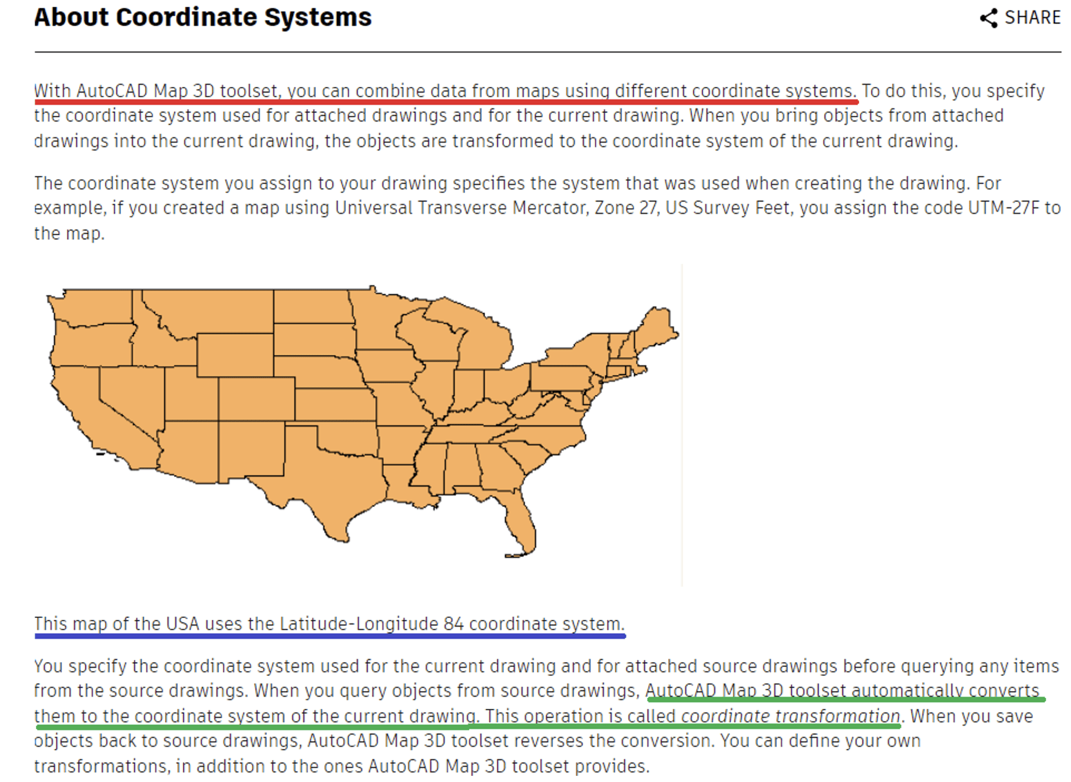 That said, users should make sure that the conversions and transformations are using the correct formulas and parameters. For example, I would like to know what defines the Latitude-Longitude 84 coordinate system that is highlighted in the box. I am not suggesting that anything is incorrect in the definition of the coordinate system. I am just saying that I do not know what the statement means; I would need more information before I can use the data.